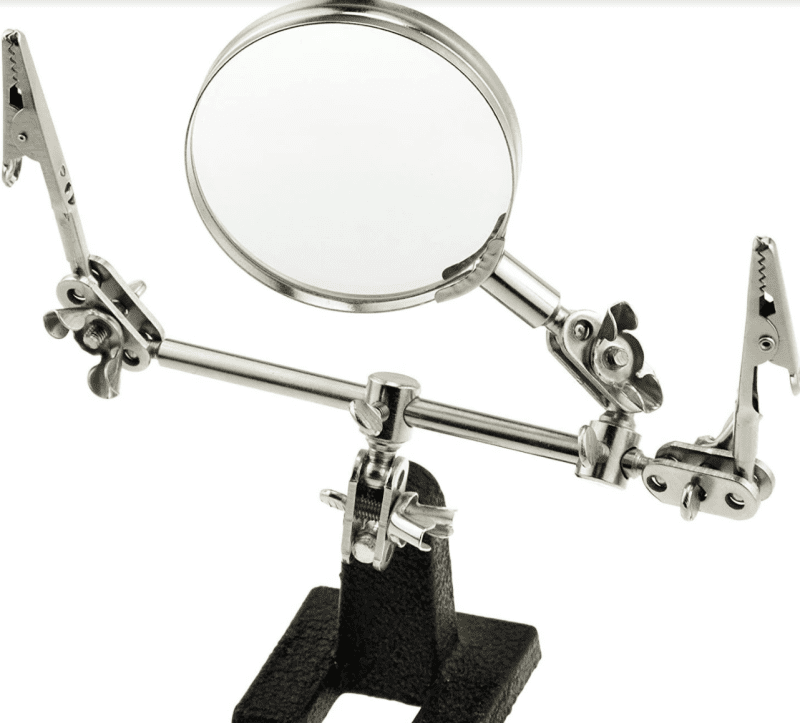 Due to various reasons, humans have two hands. Sometimes less. Balancing wires and solder and a (very hot) soldering iron, or holding a small piece steady painting, can be tricky even for the most dextrous. With movable clamps and a magnifying glass, helping hands make it easier for everyone.