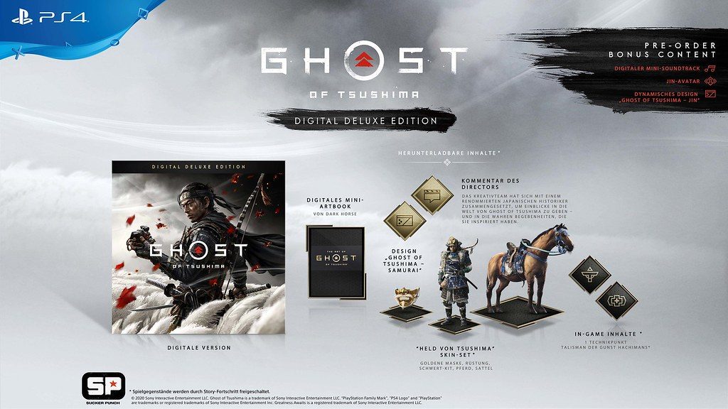 Ghost of Tsushima – Digital Deluxe Edition – hier gibt es zusätzlich ein “Held von Tshushima”-Skin-Set, 1 Technikpunkt, den Talisman der Gunst Hachimans, ein digitales Mini-Artbook sowie einen spannenden Kommentar des Directors, der tief in die Spielwelt und deren Inspirationsquellen blicken lässt.