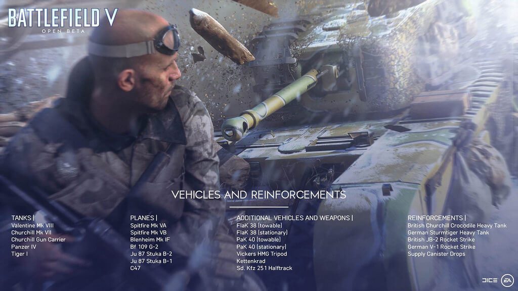 Five iconic World War II tanks and seven aircraft will be at your disposal in the Battlefield V open beta. Deploy as a Tanker and bring the big guns to the fight including the Valentine Mk VIII, Churchill Mk VII, Churchill Gun Carrier, Panzer IV, and the Tiger I. If you prefer soaring through the skies, support your team from above in the Spitfire Mk VA, Spitfire Mk VB, Blenheim Mk IF, Bf 109 G-2, Ju 87 Stuka B-2, Ju 87 Stuka B-1, and the C47.