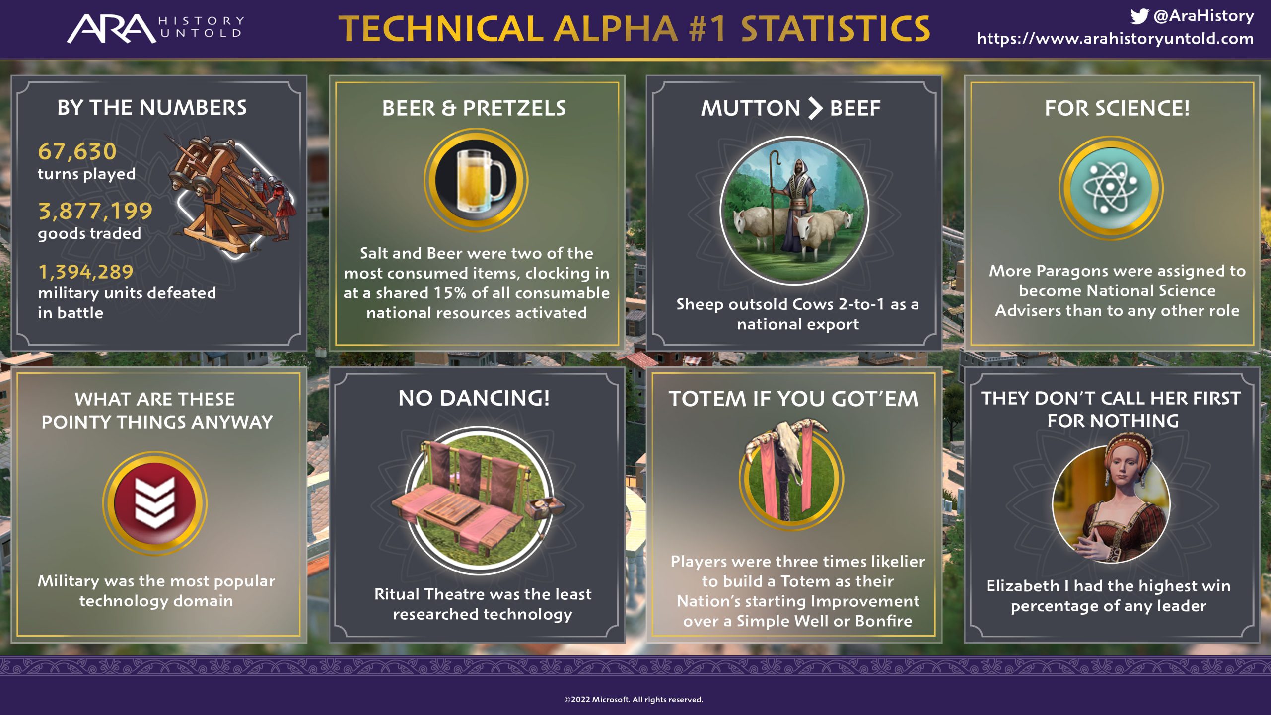 Bereits seit der Ankündigung von Ara: History Untold im vergangenen Juni sammeln wir unermüdlich Community-Feedback. Hierdurch stellen wir sicher, dass der Titel nächstes Jahr in seiner bestmöglichen Version erscheint. Dieses Feedback sammelten wir zu Beginn in einer kleinen Auswahl von Spieler*innen. Nach der Ausweitung auf eingeladene Teilnehmer*innen des Ara: History Untold Insider-Programms, schlossen wir die erste Technical Alpha erfolgreich ab. Wir haben eine Menge großartiges Feedback von unserer ersten Gruppe Alpha-Teilnehmer*innen erhalten und lernten eine Menge darüber, wo das Spiel steht und wie es sich bis zum Release noch weiterentwickeln muss. Wie Du in unserer Infografik sehen kannst, waren die Alpha-Spieler*innen ziemlich fleißig: Sie basteln, forschen und haben jede Menge Snacks auf ihrem Weg zum Sieg verputzt.