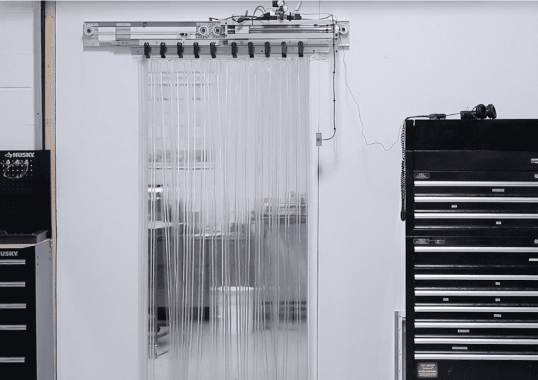 In order to separate their office and shop areas, NYC CNC installed a rubber strip assembly that had to be pushed out of the way every time someone wanted to walk through. Although functional, it was also quite annoying, so they devised a system that uses a pneumatic cylinder to automatically move the rubber strips out of the way.
