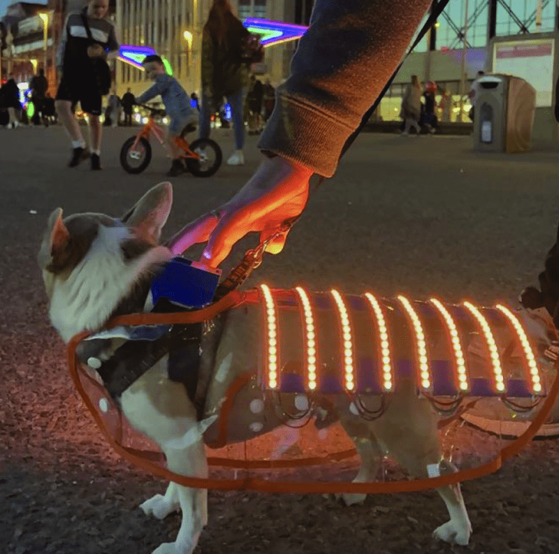 Kevin also had a cunning plan for powering everything: he’d run it all off a tiny LiPo battery, secreted in a self-contained harness that can comfortably sit on Archie’s back. Fingers crossed, the battery would last long enough for a stroll along Blackpool promenade, the home of illuminations and the perfect place to show off such a marvellously attired pup.