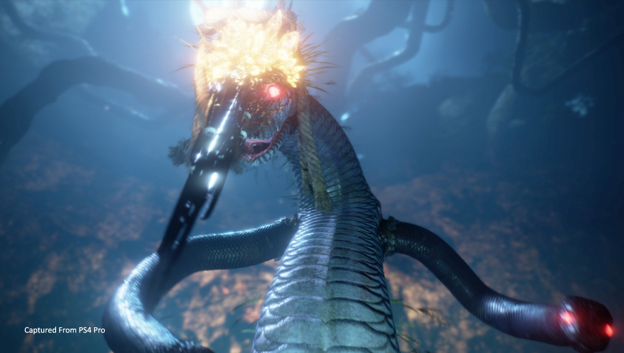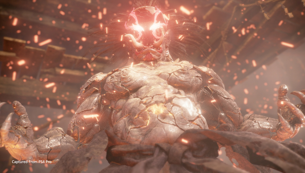 Dieser Dämon in Form einer Riesenschlange erscheint zunächst bedrohlicher, als er eigentlich ist. Denn obgleich gigantisch, ist er relativ langsam und besitzt vorhersehbare Bewegungsmuster. So gibt es gleich mehrere Schwachstellen, die schonungslos auszunutzen sind. Wenn sich das Scheusal etwa anschickt, seine Schlangenarme in den Boden zu graben, ist es eine ganze Weile schutzlos euren Combos ausgeliefert. Oder bei den rot glühenden Charge Attacks, wo sich Yatsu-No-Kami auf den Spieler zu schlängelt: Ausweichen, Combo landen und anschließend weitere Schläge austeilen, während sich die Kreatur zurück bewegt.