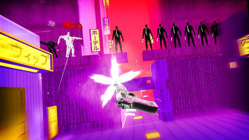 Im Gegensatz zu klassischen rhythmusbasierten Spielen sind die Levels in Pistol Whip nicht statisch, sondern dynamisch gestaltet. Ihr seid permanent und ganz bequem in Bewegung, während ihr durch unterschiedliche „Szenen” fortschreitet, die von Banküberfällen bis zu Luftangriffen an Schauplätze aus Actionfilmen erinnern.