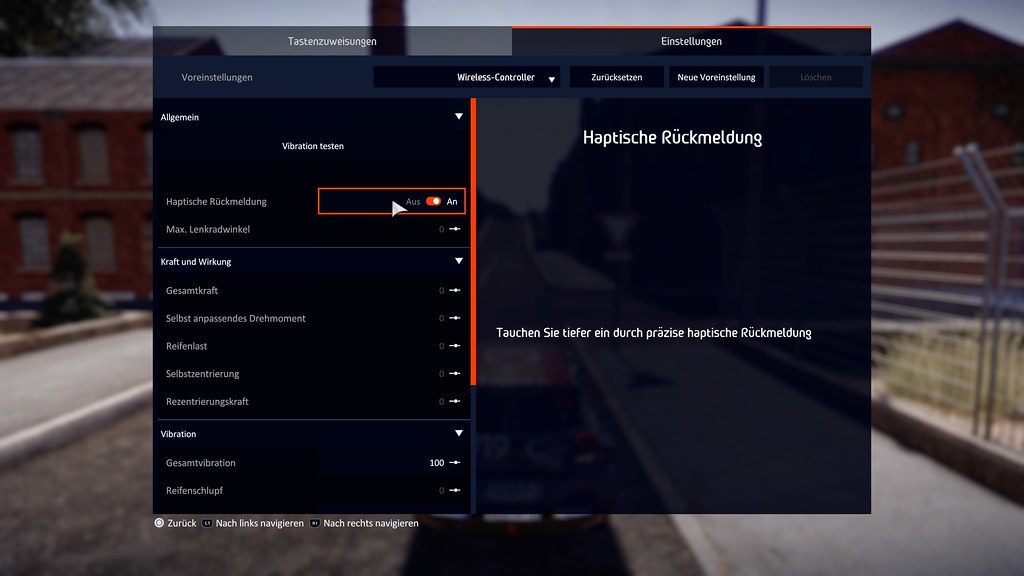 Die nicht nur optisch beeindruckende Rallye-Simulation WRC 9 setzt auf vollständige Individualisierung der Steuerung. Zahllose Option des Rallyesports, von der Reifenlast bis zur Kollisions-Vibration, lassen sich an eure Bedürfnisse und Vorlieben akribisch anpassen. Aktiviert auf jeden Fall die „Haptische Rückmeldung“ und experimentiert im Abschnitt „Vibration“ mit den Feineinstellungen. Ihr werdet jeden Hubbel auf der Piste, den Wechsel des Untergrunds, das Aufheulen des Motors oder den Widerstand des Bremspedals bis in die letzte Faser eures Körpers spüren. Realistischer werdet ihr keine virtuelle Rally fahren können.