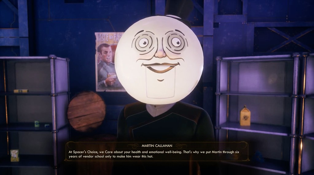And boy are some of them absurd. A distress signal might lead to a scientific community where extreme lengths are being taken to retrieve all-important research for…toothpaste. I held an entire conversation with a Spacer’s Choice salesmen wearing their moon-faced logo as a mask who will only respond with corporate approved slogans with increasing distress (TASTE THE FREEDOM!). More than one settlement involves run-ins with folks secretly hoarding freakishly large vermin-like sprats. Even NPCs are worth eavesdropping on for the laughs, as player actions shift the balance across the colony. I delighted in the option to match the absurdity by docking my character’s Intelligence points, unlocking the endlessly entertaining Dumb dialogue options and opening up a whole new can of chuckles.