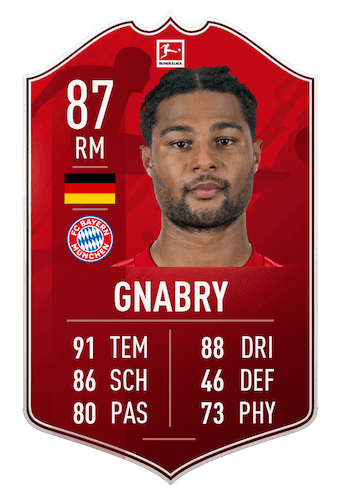 Seit Werte Passen (80) und Schuss (86) haben sich enorm verbessert. Aber auch die Defensive (46), Dribbling (88) und Physis (73) von Gnabry sind gestiegen, was ihn zu einem noch gefährlicheren Flügelspieler macht.