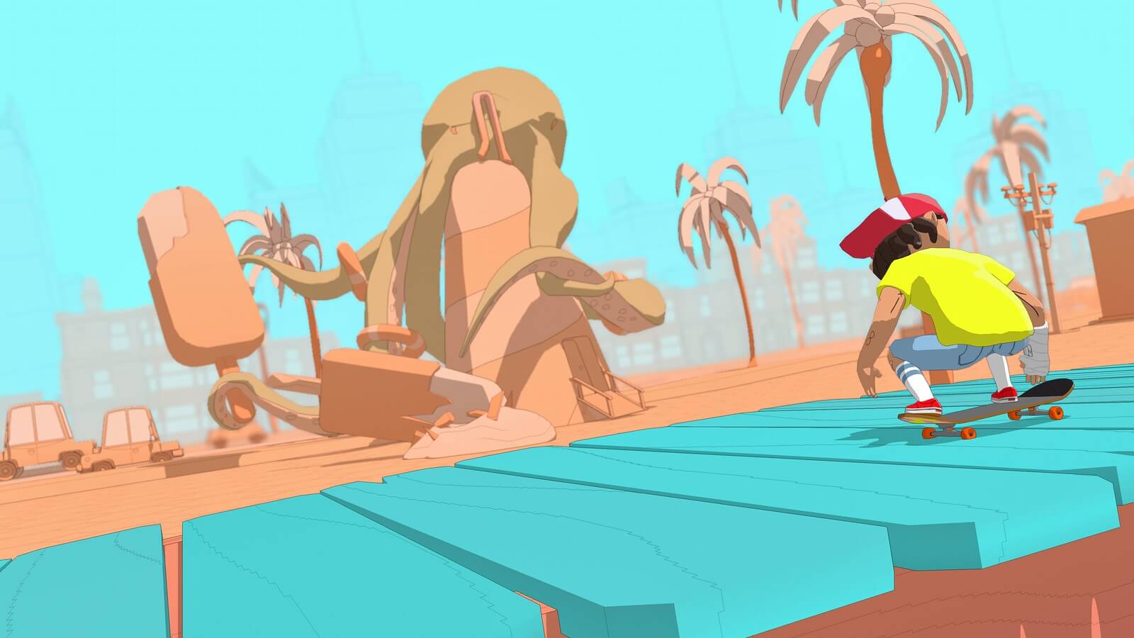 Real quick recap for everyone: OlliOlli World is an action platforming game in which you bust tricks with both sticks through a bizarre and whimsical world attempting to achieve high scores, unlock various customizations options, meet wacky and peculiar friends, and ultimately search for the skate gods of Gnarvana. You will need coordination, timing, and some practice to lay down monster combos. Skateboarding can be difficult and while we didn’t want to shy away from that, we wanted to make sure that it is approachable, and you are comfortable cruising around. There is this exhilarating feeling that comes when you stick a hardflip over an especially massive stair set and we want everyone to enjoy that. We hope you get that same feeling in OlliOlli World; the only difference is here those stairs might be over a gushing rainbow river that is home to a colossal squid. Because of course it is…