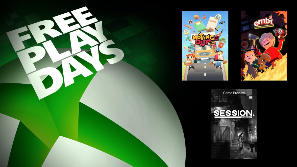 Get moving this weekend in Free Play Days. Session: Skate Sim (Game Preview), Moving Out and Embr are available this weekend for Xbox Live Gold and Xbox Game Pass Ultimate members to play from Thursday, April 28 at 12:01 a.m. PDT until Sunday, May 1 at 11:59 p.m. PDT.