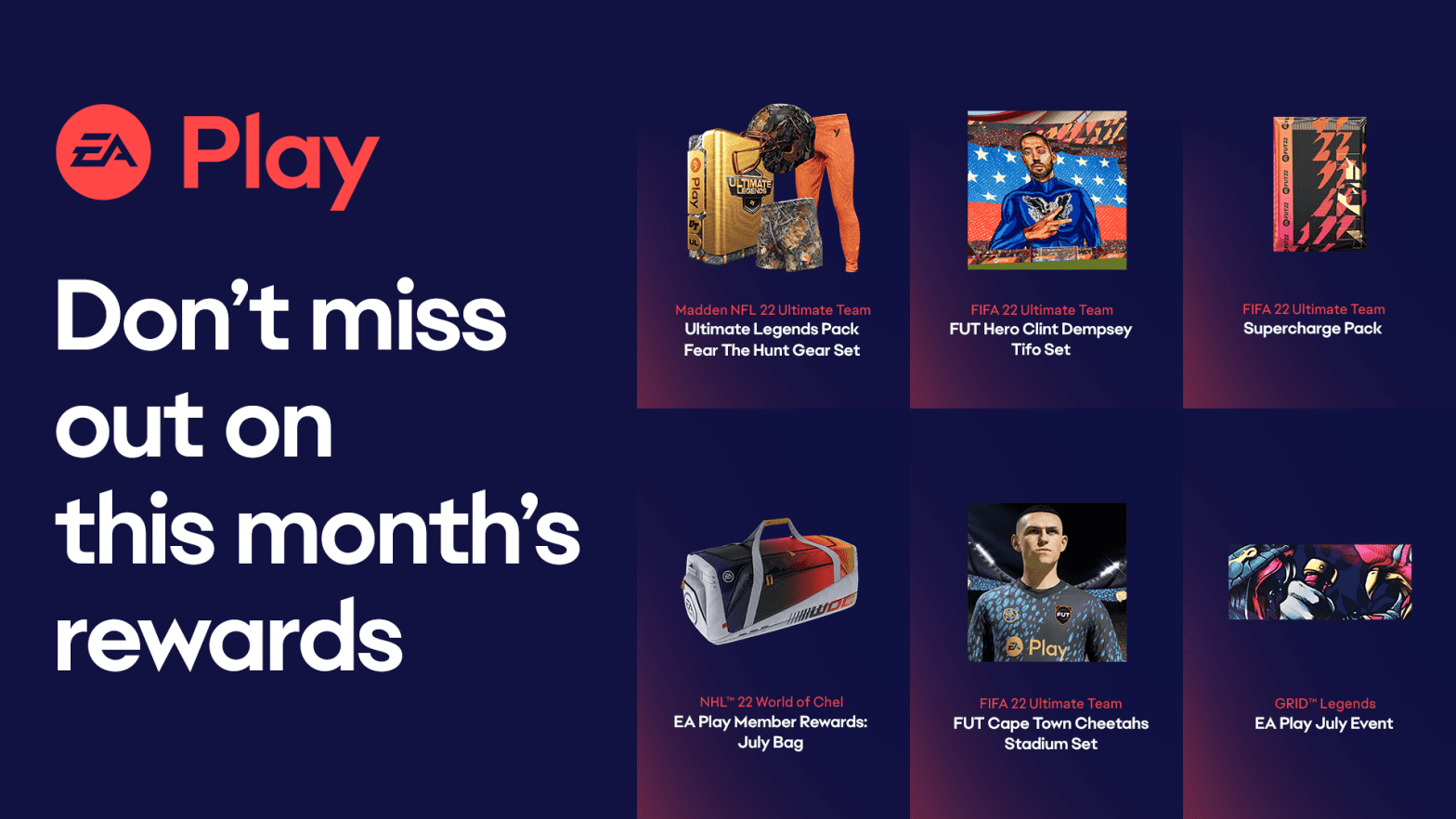 Soccer fans can enjoy the biggest victories on and off the pitch with EA Sports FIFA 22, now available on The Play List to all EA Play members. Throughout the month of July, members can get more game with recurring member-only rewards, including the EA Play Supercharge Pack, which features exclusive FUT content to help players dominate on the pitch. Members also have access to Volta apparel, Volta Coins, Ultimate Team Seasonal XP Boosts to level up faster as well as a Stadium Set.