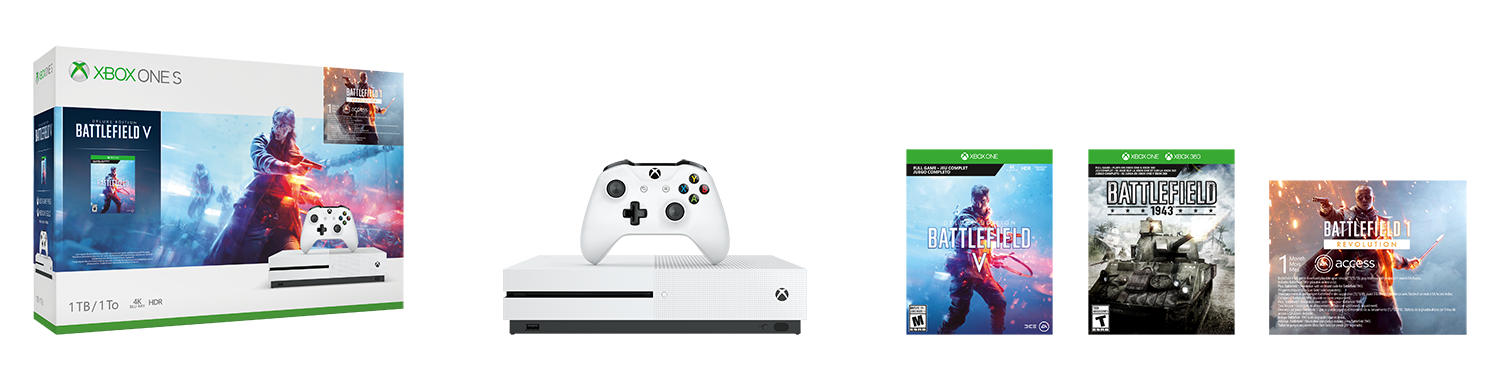 Get $50 off the Xbox One S Battlefield V Bundle and enter mankind’s greatest conflict: World War II. Join the ranks with a full-game download of Battlefield V Deluxe Edition containing paratrooper apparel for your Company of soldiers, special assignments, and weekly Airlifts. Plus, enjoy an outstanding Battlefield experience with full-game downloads of Battlefield 1943, Battlefield 1 Revolution, and one-month of EA Access.