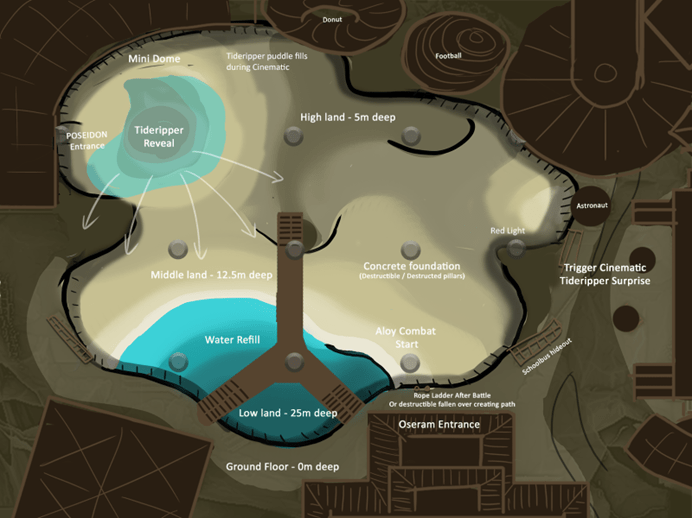 Samantha Schoonen explains how the arena for this battle was created. “We worked together with the combat team as this space required several elements to work,” she says. “the Tideripper needed a body of water to emerge from, so we built something of a beach where it could refill its Purgewater Sacs. The arena also needed to be quite deep so the player wouldn’t accidentally leave the area. Lastly, it needed a flat space for the Tideripper to move and, of course, grapple points to give Aloy a quick getaway – though some of those had to be destructible for an added challenge!”