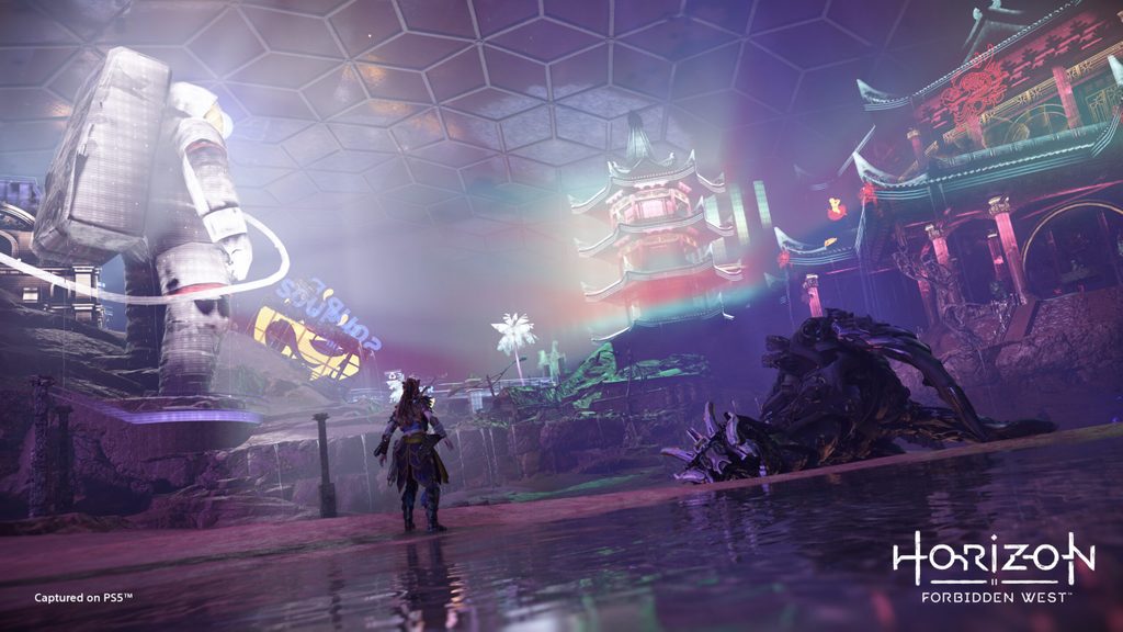 After Aloy successfully makes her way through the Snapmaw-infested waters and activates Stanley Chen’s ancient water management system, the water drains from the city. Suddenly, the scale of the dome, and the buildings within, becomes clear. Aloy must navigate them more traditionally by climbing, gliding, and running, with the dome becoming a large arena for an awesome battle.