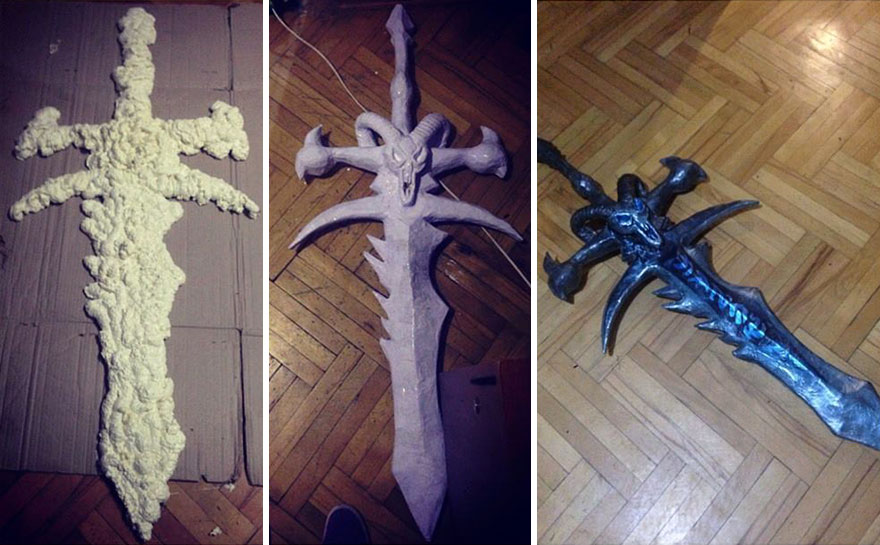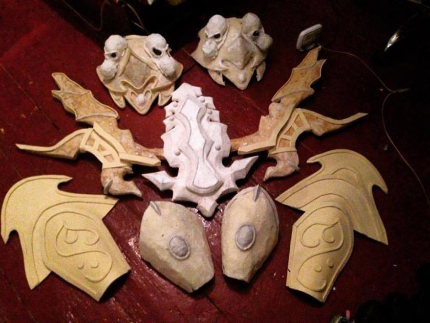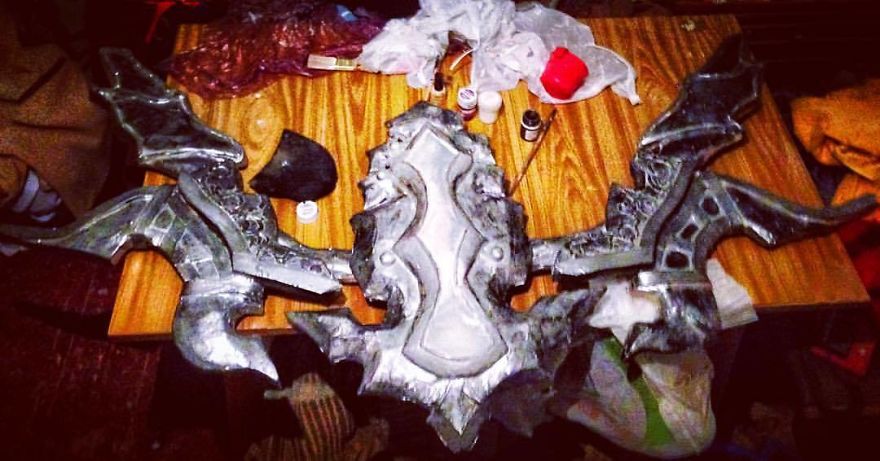 In early 2013 I had no idea of what the cosplay was, like most of the population here. I just loved the Halloween (which was pretty restricted here, my country is religious and the church doesn’t like Halloween at all) so usually, there were some spots in my city where you could go in your costume and have a little bit of fun. This was the only reason I was crafting something on my own. In 2013 I saw the tutorial about how to make Arthas cosplay from World of Warcraft (i’m a huge fan of World of Warcraft), that time I owned the hostel, was spending all the time there to handle the business, which eventually failed due the currency drop, but this was the place where everything has started. I have started to craft in a small room right in the hostel. I didn’t want to spend a lot of money on it so I have bought the Insulation Foam Cans for the Frostmourne Replica, once it cooled down I have carved the replica out of it, using the cheap paper knife. I couldn’t leave the hostel event for a second, as I was alone there (no season) in order to get the white PVA glue. Found some flour in the kitchen, so I boiled my very own organic GLUE for paper-mache. Layer by layer, day by day I was coating the weapon. Used the foamy transparent synthetic stripes (i don’t even know how it is called, they usually use it to glue around the windows, in order to keep the warmth) for the horns, rolling and cutting each one, I was super happy to find the glue gun in tools. One of my customers agreed to sacrifice his hiking/yoga mat, so I could craft the armor out of it. The skulls, dots and some “landscape” touches are made of cold porcelain, which I have “cooked” myself as well.