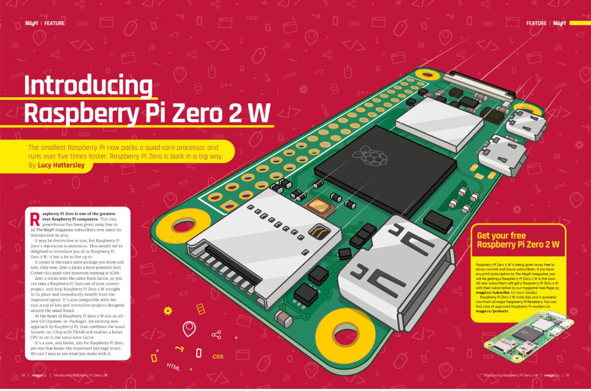 Raspberry Pi Zero 2 W packs far more power into the same space. The new quad-core 1GHz CPU is up to five times as fast as the original Zero and Raspberry Pi Zero 2 W is compatible with all current Zero projects and kits. In this month’s edition of The MagPi: