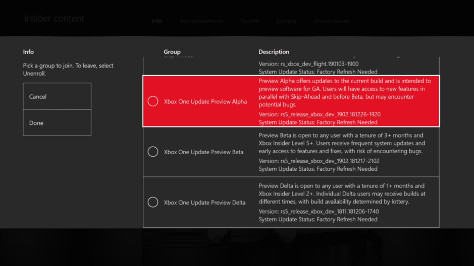 Starting at 2:00 p.m. PST today, members of the Xbox One Preview Alpha Ring will begin receiving the latest 1908 Xbox One system update (Build: 19H1_RELEASE_XBOX_DEV_1908\18362.6049.190722-1945).
