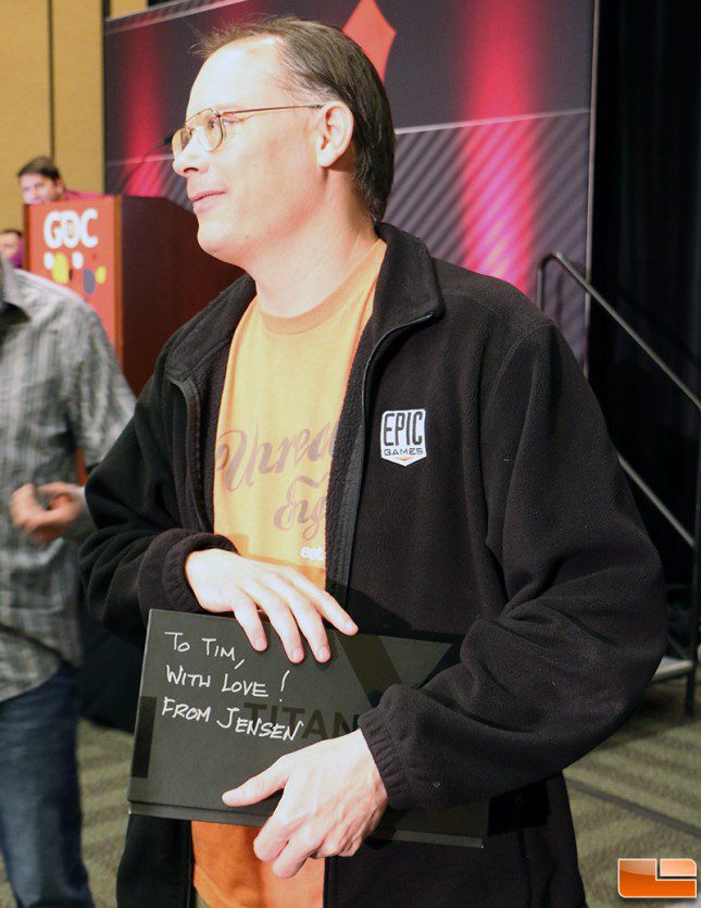 We just walked out of Epic Games presentation by Tim Sweeney on the State of Unreal session at GDC and we have some exciting news to bring you from NVIDIA! NVIDIA CES Jen-Hsun Huang made an appearance at the presentation during the part where Mr. Sweeney was saying there is demand for more powerful graphics cards. Jen-Hsun carried in a covered box and said that he was here to answer the call with a new graphics card called Titan X!