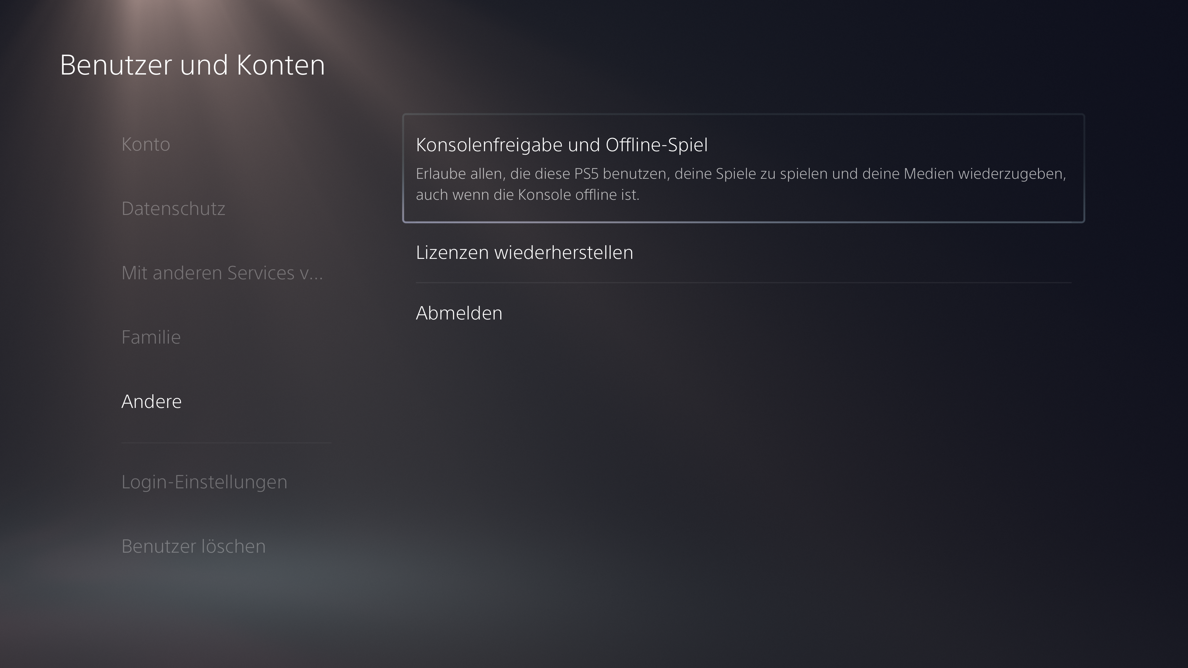 Geht dazu in eurem Benutzerkonto zu den [Einstellungen] – [Benutzer und Konten] – [Andere] und aktiviert Konsolenfreigabe und Offline-Spiel. Schon können Geschwister oder Freunde auf eure Bibliotheken zugreifen, wenn sie als Benutzer auf der PS5 angemeldet sind.