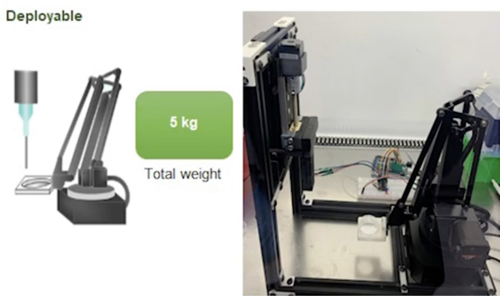 This entire bioprinter can fold up into a backpack. It has a custom print head driven by an Arduino Mega 2560 development board and Python code. That extrudes the biological ink. An off-the-shelf UFactory uArm Swift Pro robotic arm moves a Petri dish in three dimensions beneath the print head. The upright structure, which contains the print head, folds down when not in use in order to aid in packing. Deployment takes only 15 minutes and the entire machine weighs less than 11 pounds. The total cost to build the complete machine is under £1,000 ($1,250).