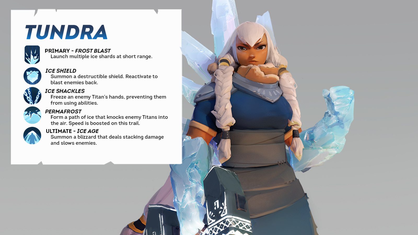 - Tundra: Frost Blast (Primary), Ice Shield, Ice Shackles, Permafrost, Ice Age (Ultimate)