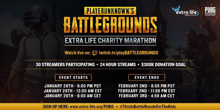 From January 29th until February 2nd, PLAYERUNKNOWN’S BATTLEGROUNDS is teaming up with Extra Life to raise $300,000 for sick and injured kids in Children’s Miracle Network Hospitals! Best of all, PUBG Corporation will match every dollar up to $300,000!