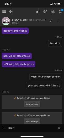Example of filtered messages on the Xbox mobile app with the Medium filter level set. This filter level allows for some vulgar words while still limiting harsher vulgarities and phrases identified as bullying.