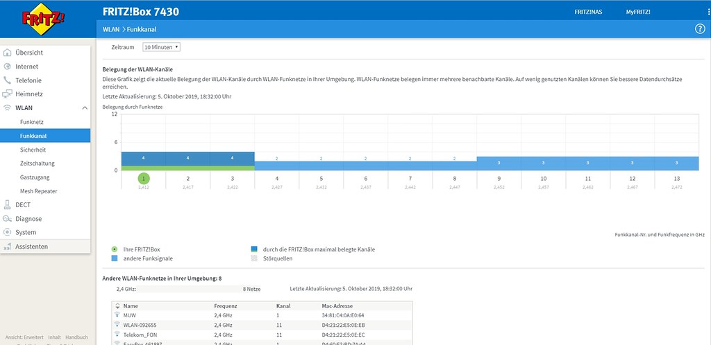Wohnt ihr mitten in der Stadt, dann ist die Chance hoch, dass ihr eine Menge WLAN-Netzwerke in der unmittelbaren Umgebung habt. Ihr könnt in eurem Router einstellen, welchen Funkkanal ihr benutzt. Nehmt entweder die automatische Auswahl oder schaut euch die Belegung in der Übersicht an und wählt den Kanal aus, auf dem sich weniger konkurrierende WLAN-Netze befinden.