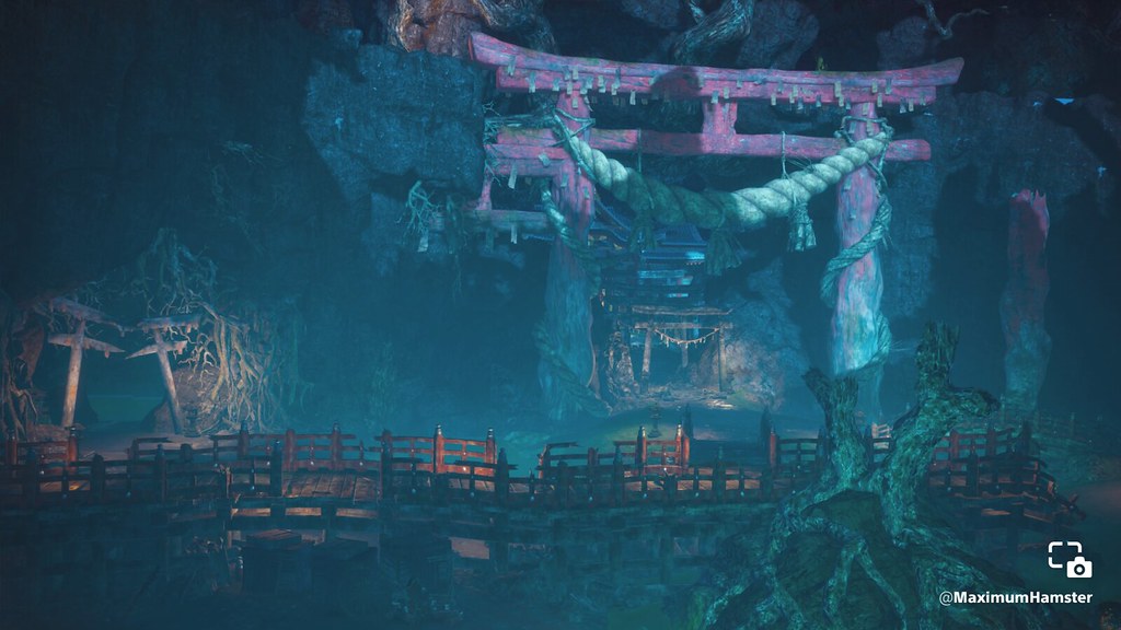 The moon shines a blue hue over this Nioh 2 archway, shared by MaximumHamster.