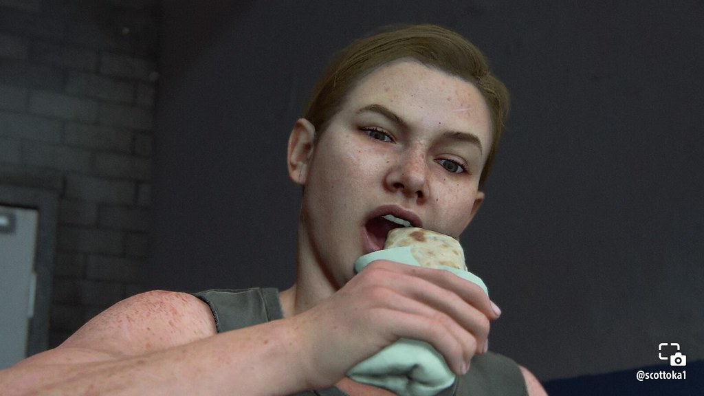 Abby scarfs down a burrito in The Last of Us Part II, shared by scottoka1.