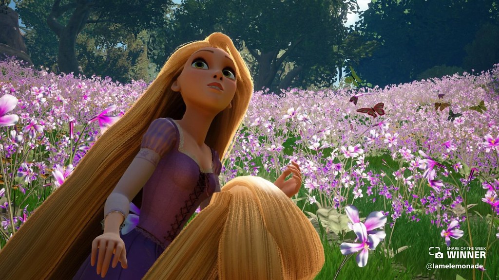 Rapunzel gathers her hair while walking through this idyllic field in Kingdom Hearts III, shared by @lamelemonade_.