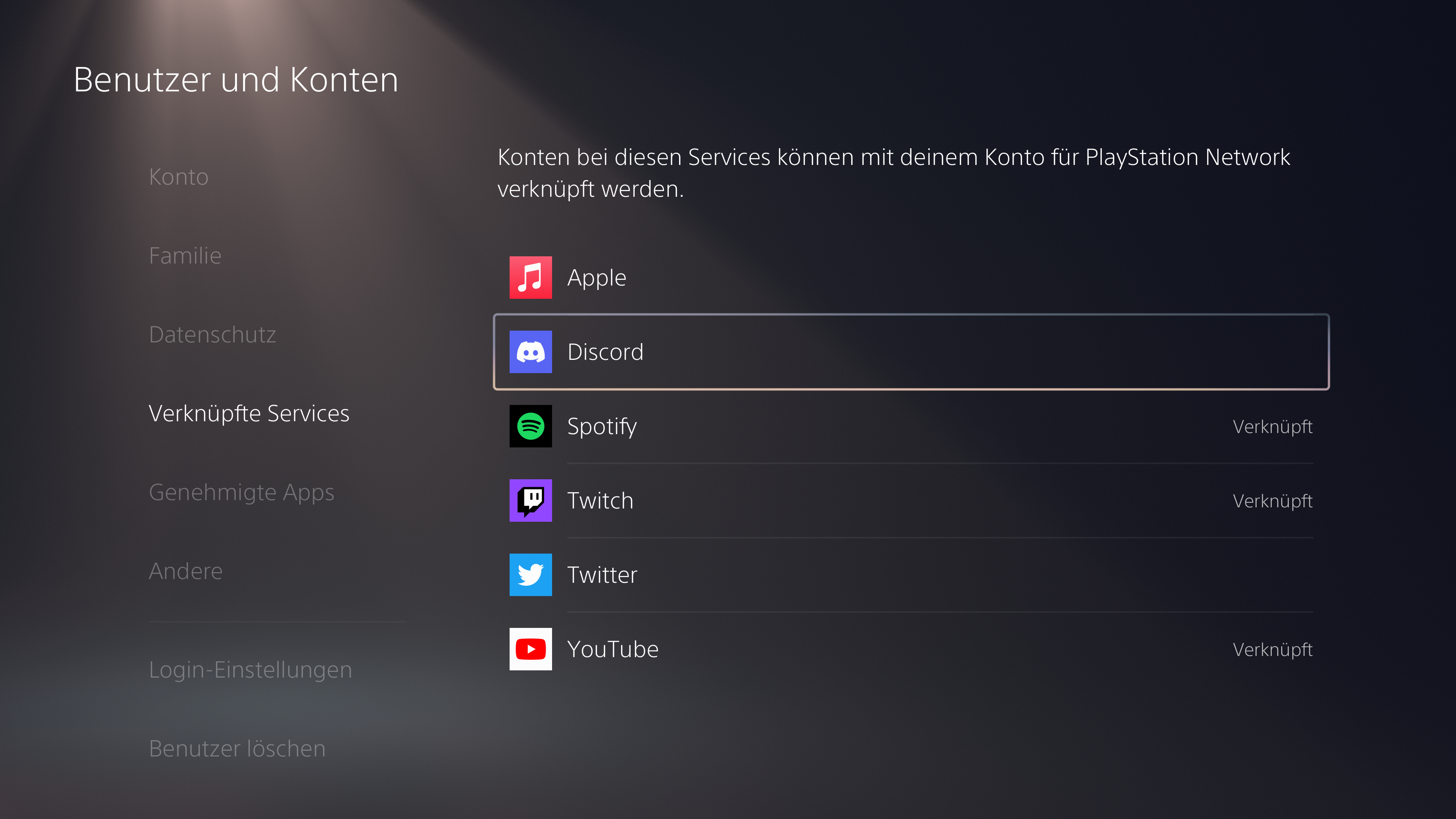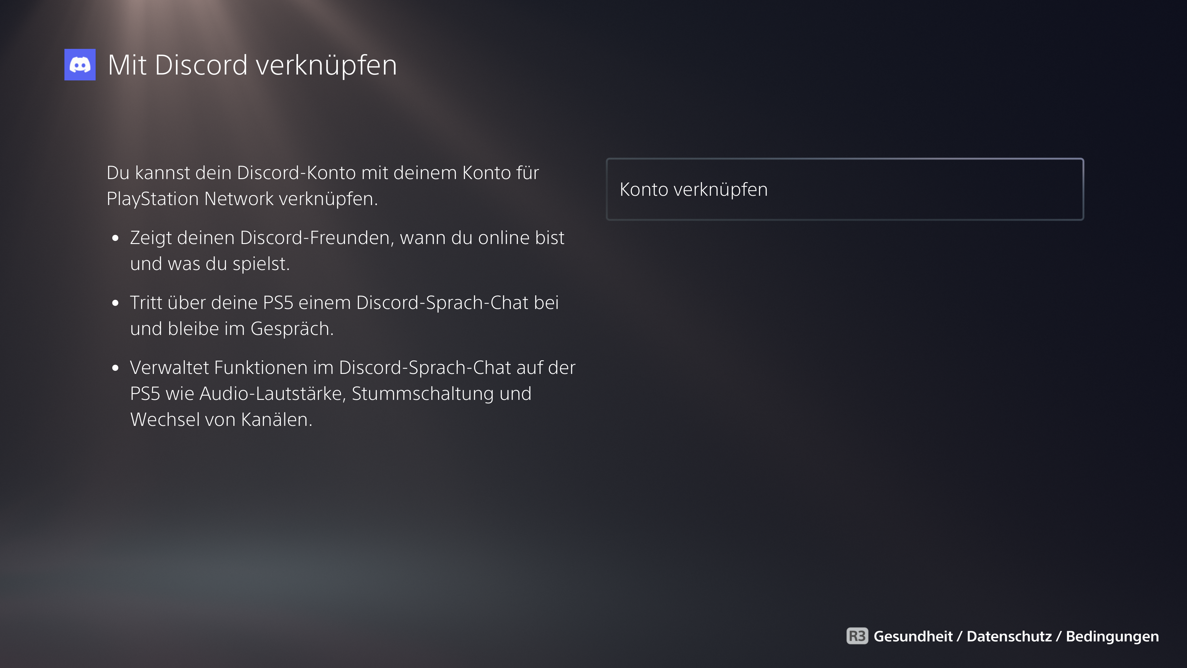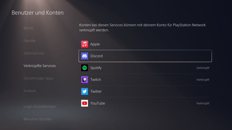 Geht auf eurer PS5 zu [Einstellungen] – [Benutzer und Konten] – [Verknüpfte Services]. Hier seht ihr auf der rechten Seite die Liste der Dienste, mit denen ihr euer PSN-Konto verknüpfen könnt. Wählt Discord aus und bestätigt auf der folgenden Seite eure Auswahl mit Konto verknüpfen. Bitte beachtet: Wenn ihr bereits früher eine Verbindung mit Discord erstellt habt, müsst ihr eine neue Verknüpfung erstellen, um den Sprach-Chat nutzen zu können.