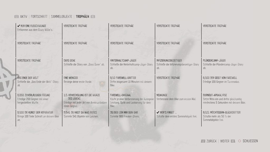 - Wer’s findet … (Bronze) – Es gibt reichlich Sammelobjekte in Days Gone, sobald ihr das erste findet, ploppt die Trophäe auch schon auf.
