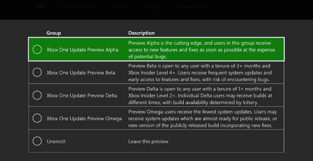 - Switch between any of the Xbox One Preview Update rings you’ve unlocked faster than ever before. Whether you’re moving from Alpha to Omega or vice versa, you can now easily enroll in any of the System Update rings available to you in the Xbox Insider Hub. This gives you more control over the number of updates you’re receiving and how quickly you’re gaining access to brand new Xbox features. Not only is this process easier and more flexible than ever before, but since August, we’ve introduced an update that makes changes to your enrollment status nearly instantaneous.