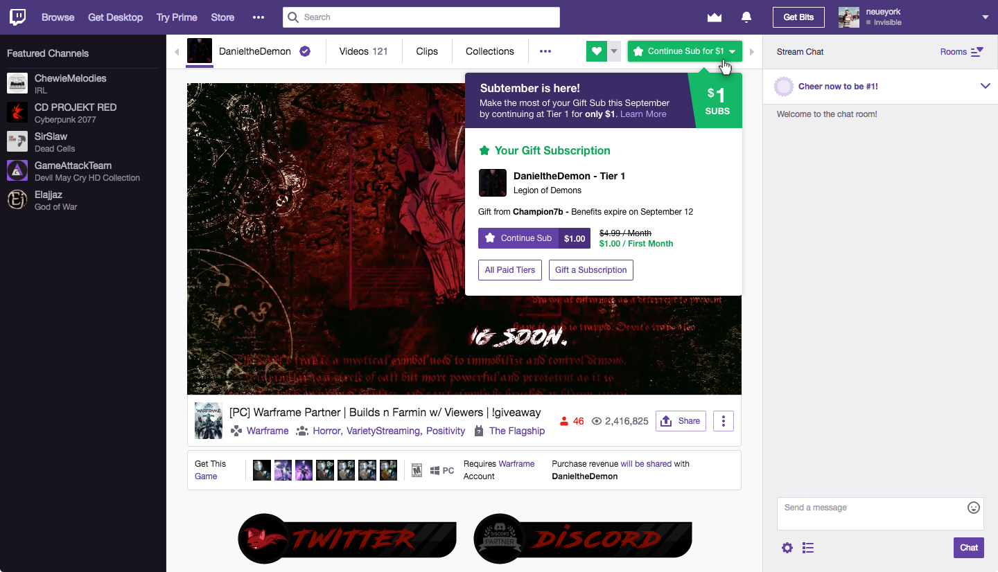 If you’ve already set up your gift subscription to renew between 9/10 and 9/30, you can still take advantage of SUBTember pricing. To obtain the promotional price, you’ll need to cancel the Sub continuation at your subscriptions management page and then choose to continue the gift sub again between 9/10 and 9/30 .