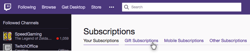 2. Visit your subscriptions management page and click on the “Gift Subscriptions” tab. Then find the streamer’s panel and click “Continue.”