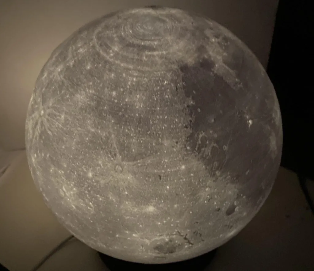 At first glance, this looks like the kind of moon lamp that has been very popular in recent years. Such lamps are common 3D printing projects, because it is possible to use real topographic data to create a 3D lithophane that makes the terrain visible. A lithophane is a piece of artwork made using a thin, translucent sheet of varying thickness. When backlit, the thicker areas look darker and the thinner areas look lighter. Like the popular moon lamps, this project starts with a 3D-printed lithophane of the moon. With a light source inside, it looks like an accurate lunar model.