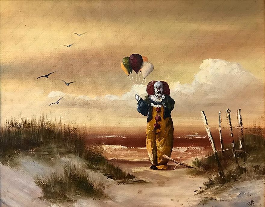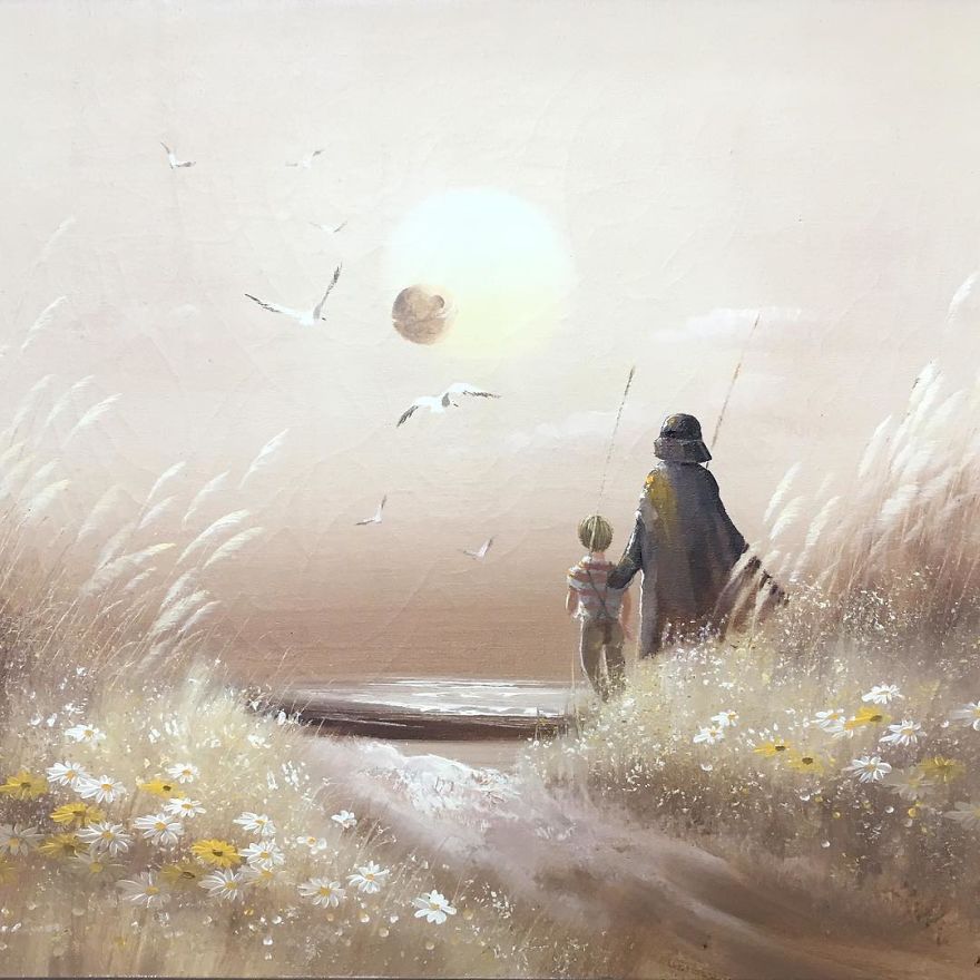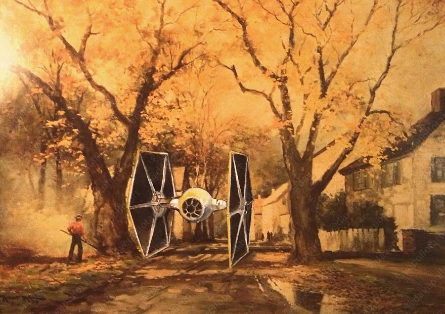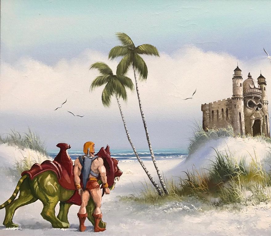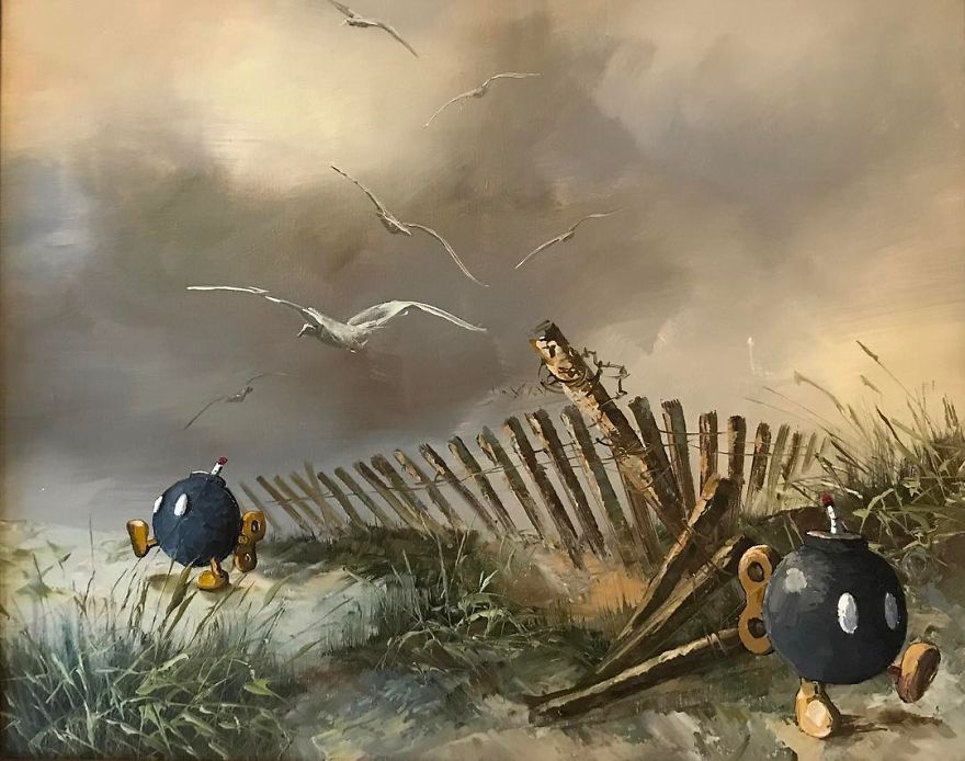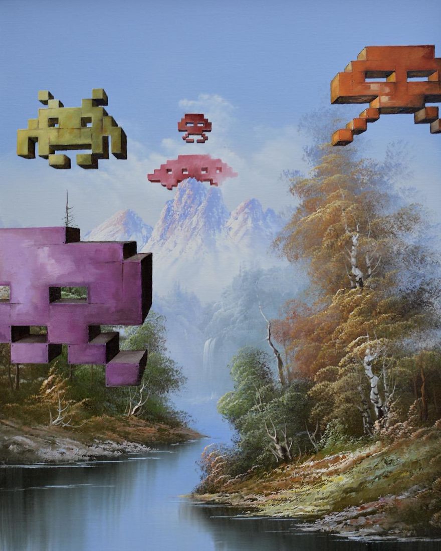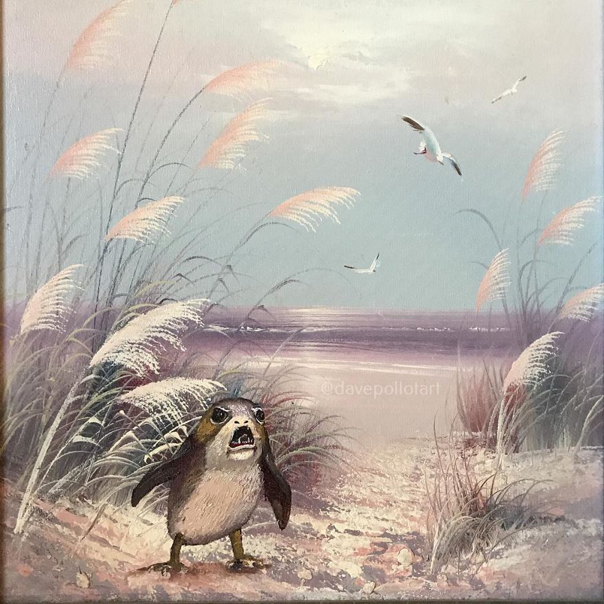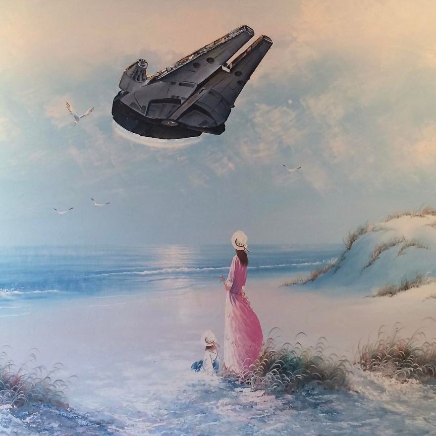 Dave Pollot (previously here and here) is a US painter who brings new life to old and forgotten art. He buys thrift store paintings and perfectly “enhances” them with pop culture symbols, giving a cool, nerdy spin to what’s dusting away inside cracked frames.