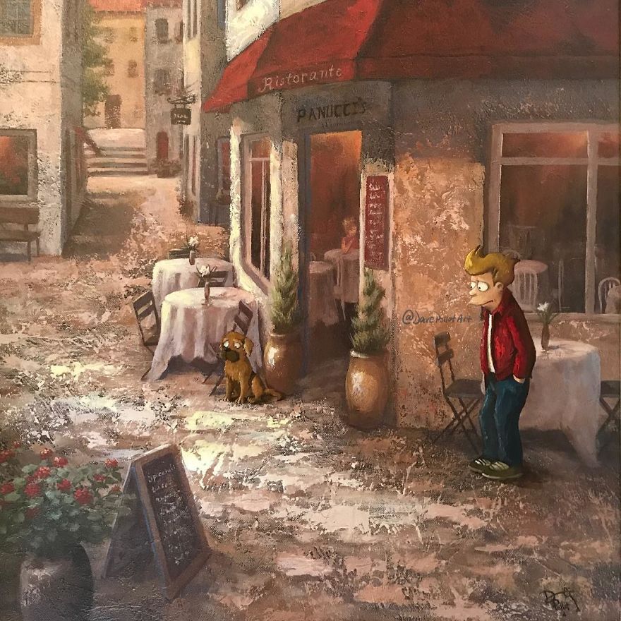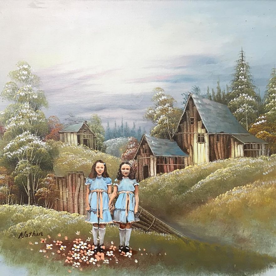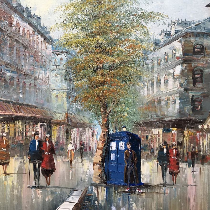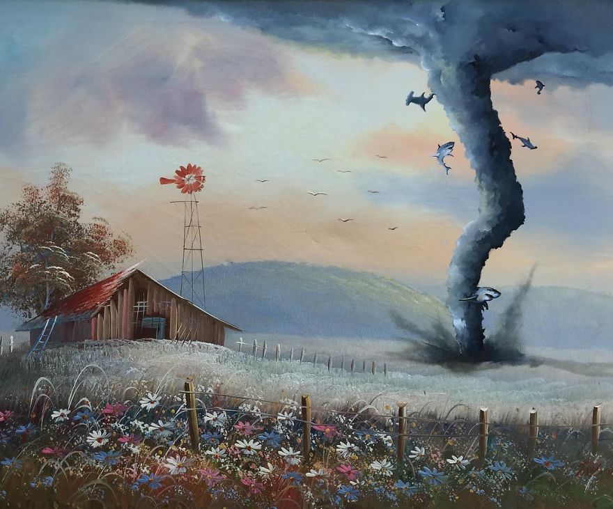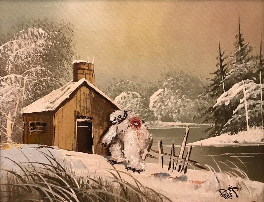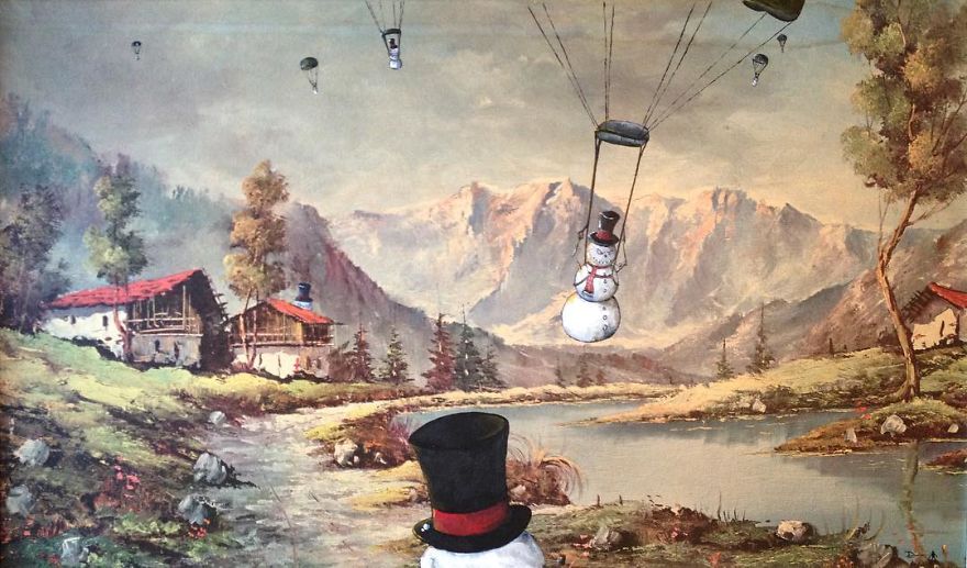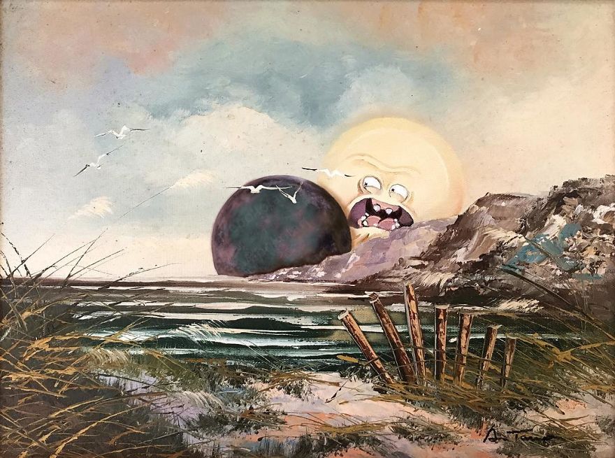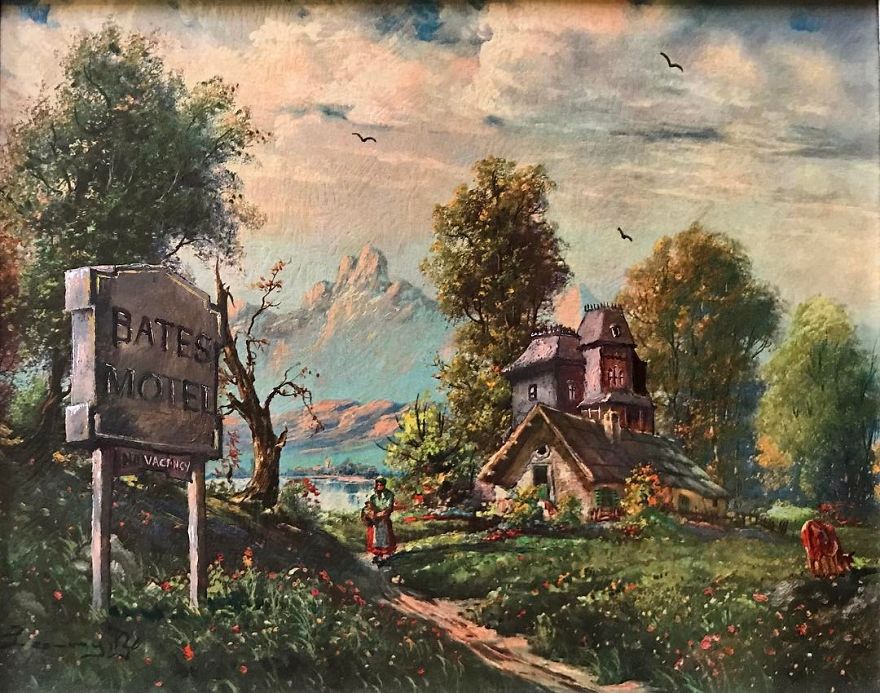 “Most are prints or lithographs,” he told Bored Panda. “Any scratches or marks are carefully touched up and then my own visions are added.” Before focusing on repurposing discarded thrift art, Dave painted more ‘serious’ architectural paintings and landscapes. Now, however, he’s completely devoted to his new passion.