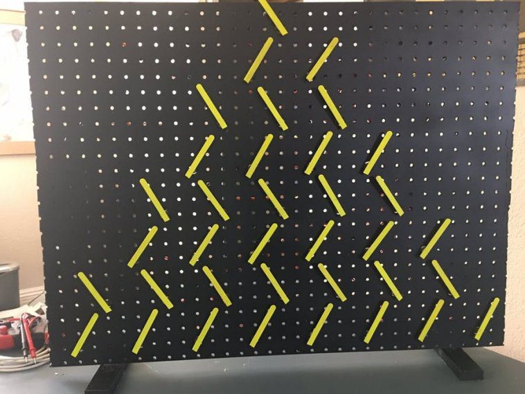 The device features 36 servo motors arranged on a pegboard to produce various patterns, and can even be used in an interactive mode where it follows a person’s hand around with the help of ultrasonic sensors.