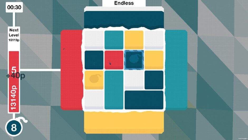 The game modes are mainly divided into two groups. The ones with “absorbent sides” and the ones without. The absorbent sides are the ones in charge of sucking up the nearby blocks of the same color. These blocks are necessary for advancing levels because, without them, you’ll likely block yourself. Since absorbent sides generate new blocks, you can also get bomb-tiles that can be used to destroy larger blocks limiting your movements. In Endless mode, for example, you’ll fight against time to erase blocks in an increasingly large grid.
