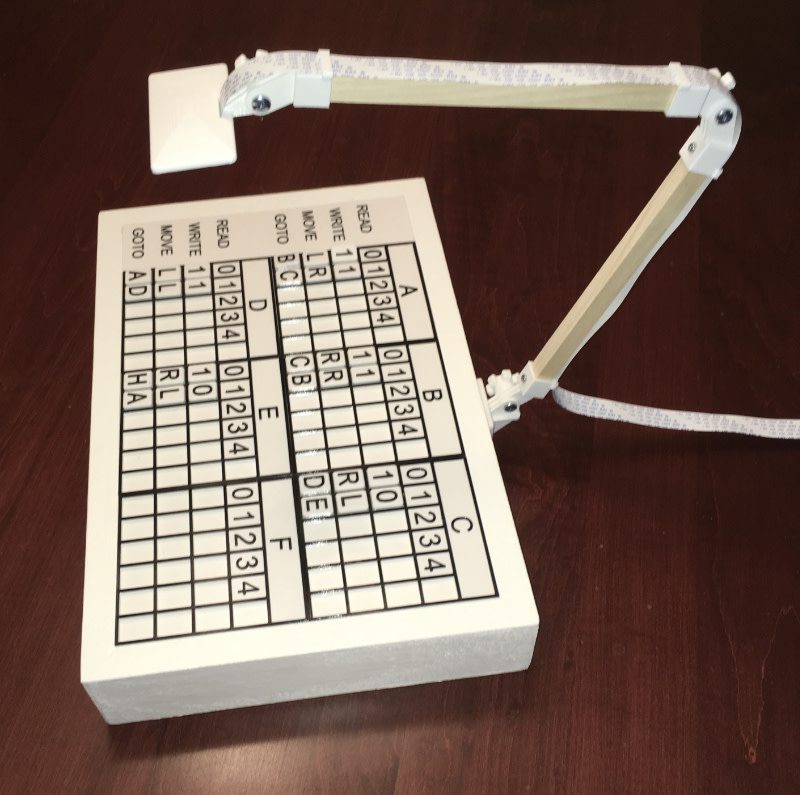 His TMD-2 makes use of a Raspberry Pi 3, an Official 7-inch Touch Display for the user interface, and a Camera Module mounted on an articulated arm above a ‘State Transition Table’ box. The latter can hold one of a selection of table cards 3D-printed by Michael, along with a set of alphanumerical tiles to place on them. The camera scans the current state of the machine, which is read using the Tesseract OCR (optical character recognition) library. The resulting computations are then shown on the Touch Display.