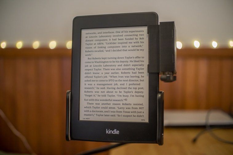 Not since Rick and Morty’s butter-passing robot has there been a more hyper-specific, purpose-built device than perhaps Alex Mikes’ automatic Kindle page turner. Instead of having to raise his arm to tap the edge of the screen while reading in bed, a simple click of a wireless remote makes the attached contraption do all of that hard work for him.