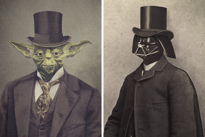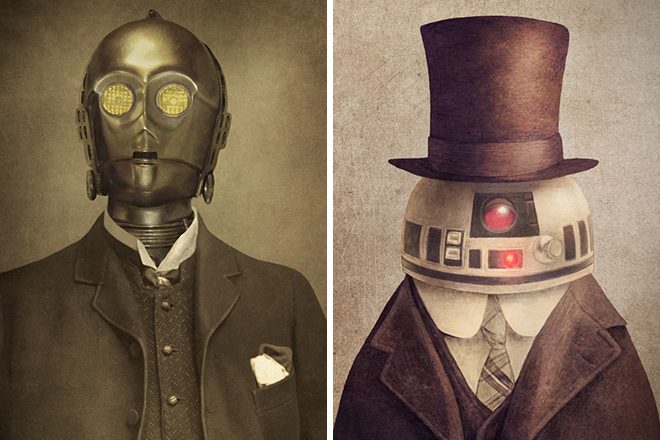 Star Wars fan and talented artist Terry Fan combined his two passions in a new series called „Victorian Wars“. This is exactly as it sounds, famous characters from the franchise, such as R2-D2, Chewbacca, wearing outfits from the Victorian / Steampunk era. For those who have never heard of Steampunk, it’s basically a subgenre of science fiction that incorporates technology and aesthetic designs inspired by 19th-century industrial steam-powered machinery. This genre features anachronistic technologies or retro-futuristic inventions as people in the 19th century might have envisioned them, and is likewise rooted in the era’s perspective on fashion, culture, architectural style, and art.
