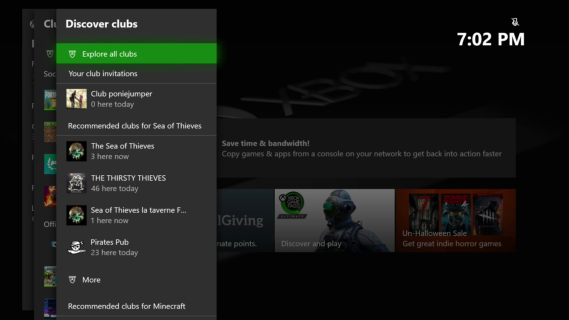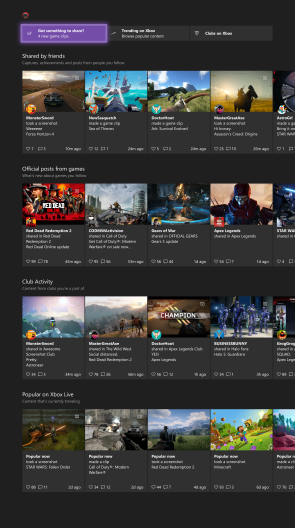 New channels on Community page: we’ve heard your feedback on the Community page and are now rolling out an experiment that will make it more clear where your Community content is coming from. With this new layout update you will be able to browse through four different channels and keep up with what’s happening with your Friends, Clubs, Official Clubs and around Xbox Live!